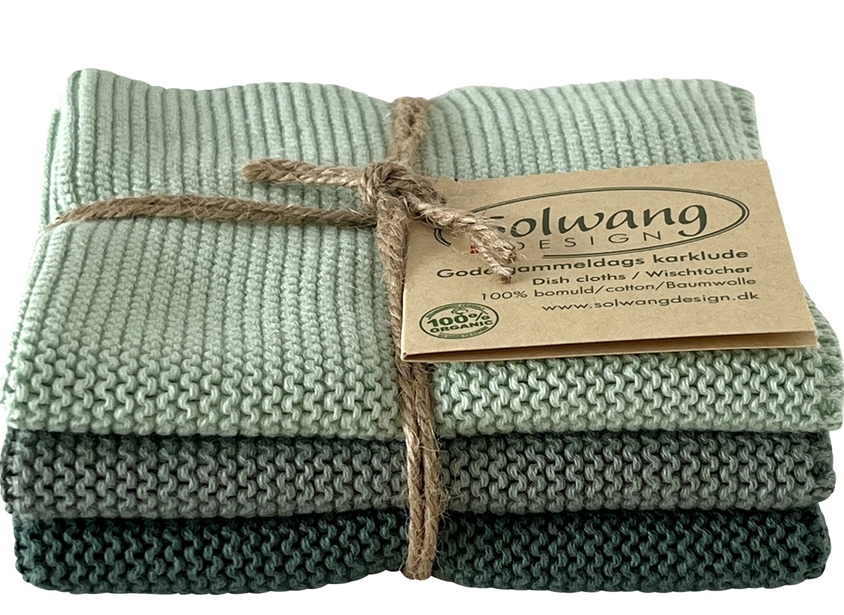 Wunderschön gestrickte Solwang Reinigungstücher in arktisch Grün. Im 3er-Set gebunden mit Schnur und Etikett. Dabei sind die Spültücher in Krausrippe gestrickt um die Saugfähigkeit und Funktionalität zu optimieren.
