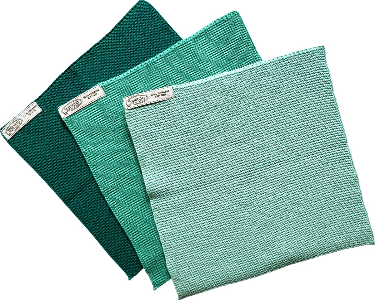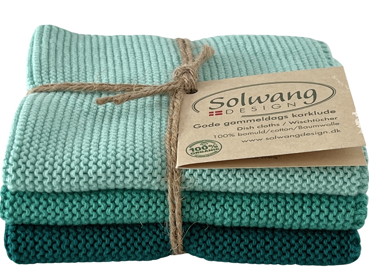 Wunderschön gestrickte Solwang Reinigungstücher in helles Türkisgrün. Im 3er-Set gebunden mit Schnur und Etikett. Dabei sind die Spültücher in Krausrippe gestrickt um die Saugfähigkeit und Funktionalität zu optimieren.