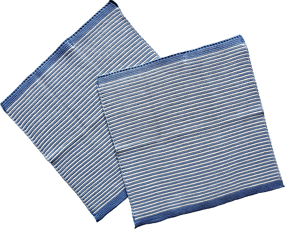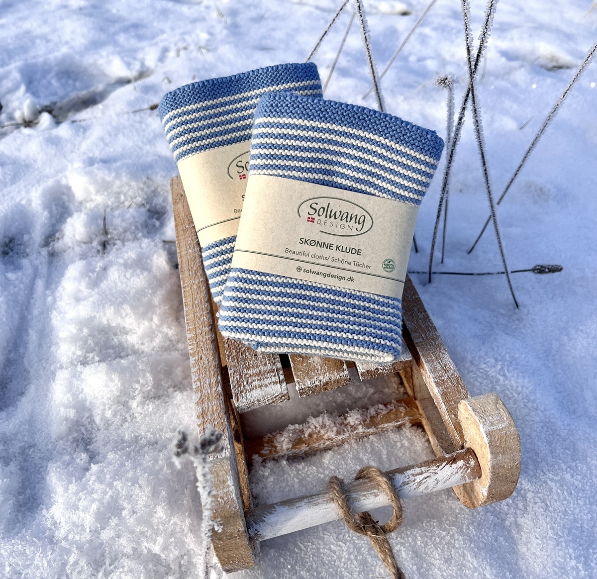Neue Serie von gestreiften Tüchern in der Farbe Natur-Blau. Die Reinigungstücher von Solwang sind in Krausrippe gestrickt und